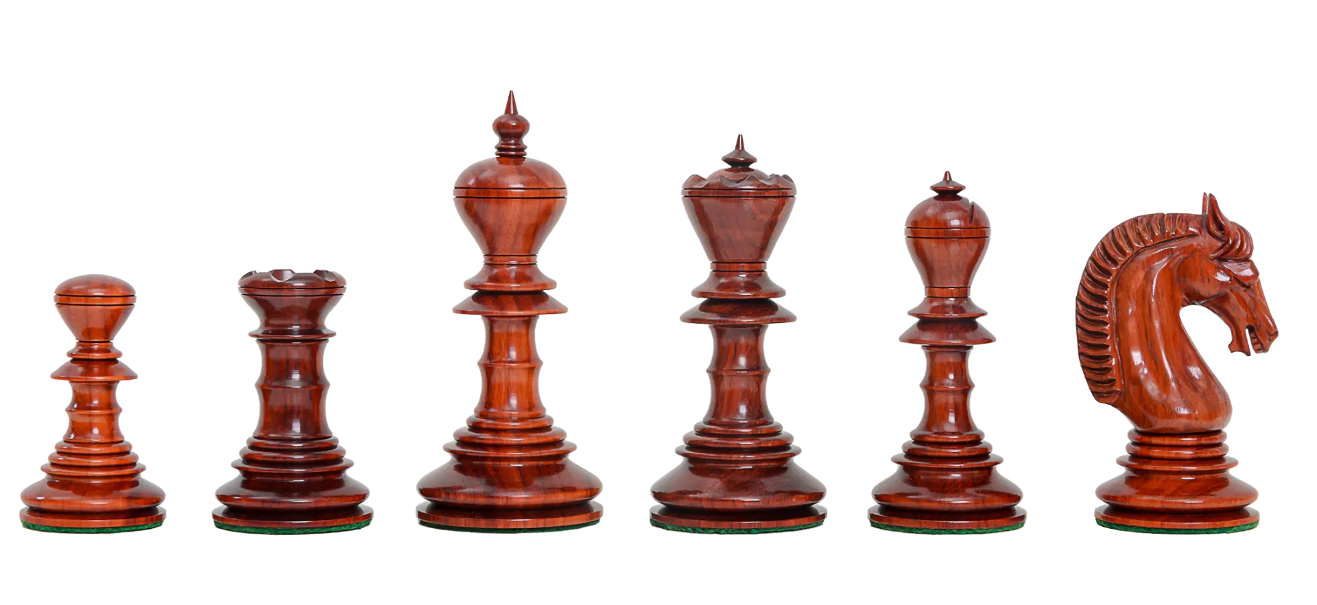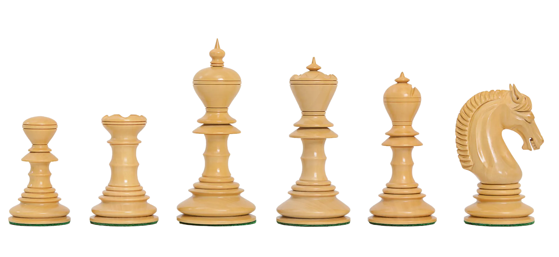 To pamper you, The House of Staunton is proud to offer the The Segura Series Luxury Chess set. This heirloom- quality Chess set features a 4.3" King with a 1.85" diameter base and are hand carved by our master artisans and crafted out of the highest grade woods. The Chess pieces are heavily weighted with gold embossed English Leather base pads under the Kings, luxurious billiard cloth base pads on the other Chess pieces and a beautiful finish.