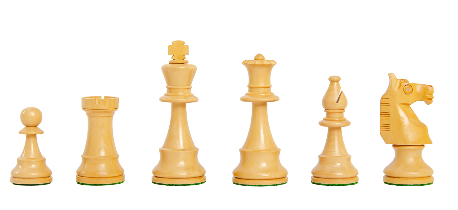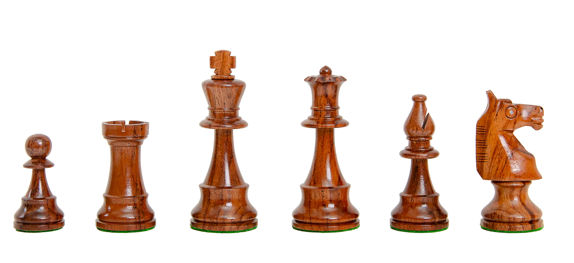 The Cavalier Chessmen by Lardy of France were  sometimes sold under the Kismet name. The individual chessmen were crafted from a subtly figured Olivewood and Rosewood, were weighted and were cushioned atop green felt base pads. These chessmen were offered in a variety of sizes. The original chessmen had a natural finish which responded well to an occasional light buffing with a cotton cloth. These chessmen had one very unique character. The whimsical-appearing Knight had white ceramic eyes with black pupils. The chess pieces were housed in a divided cardboard box. These sets were produced after WWII, probably around 1970.