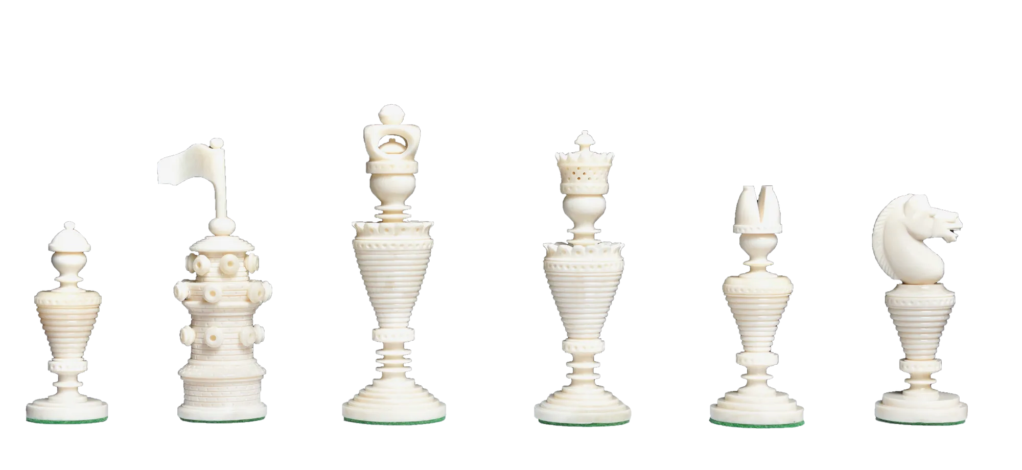 "Crafted to replicate the exquisite design and detail of the Circa 1800 Anglo-Dutch Bone Chessmen from the renowned workshops of George Merrifield and Thomas Lund."