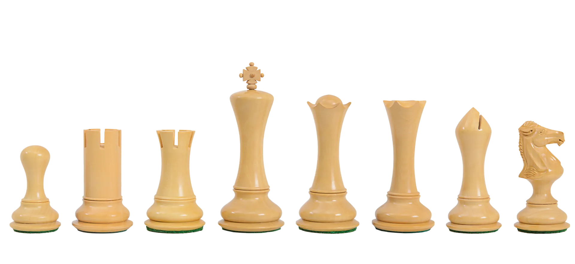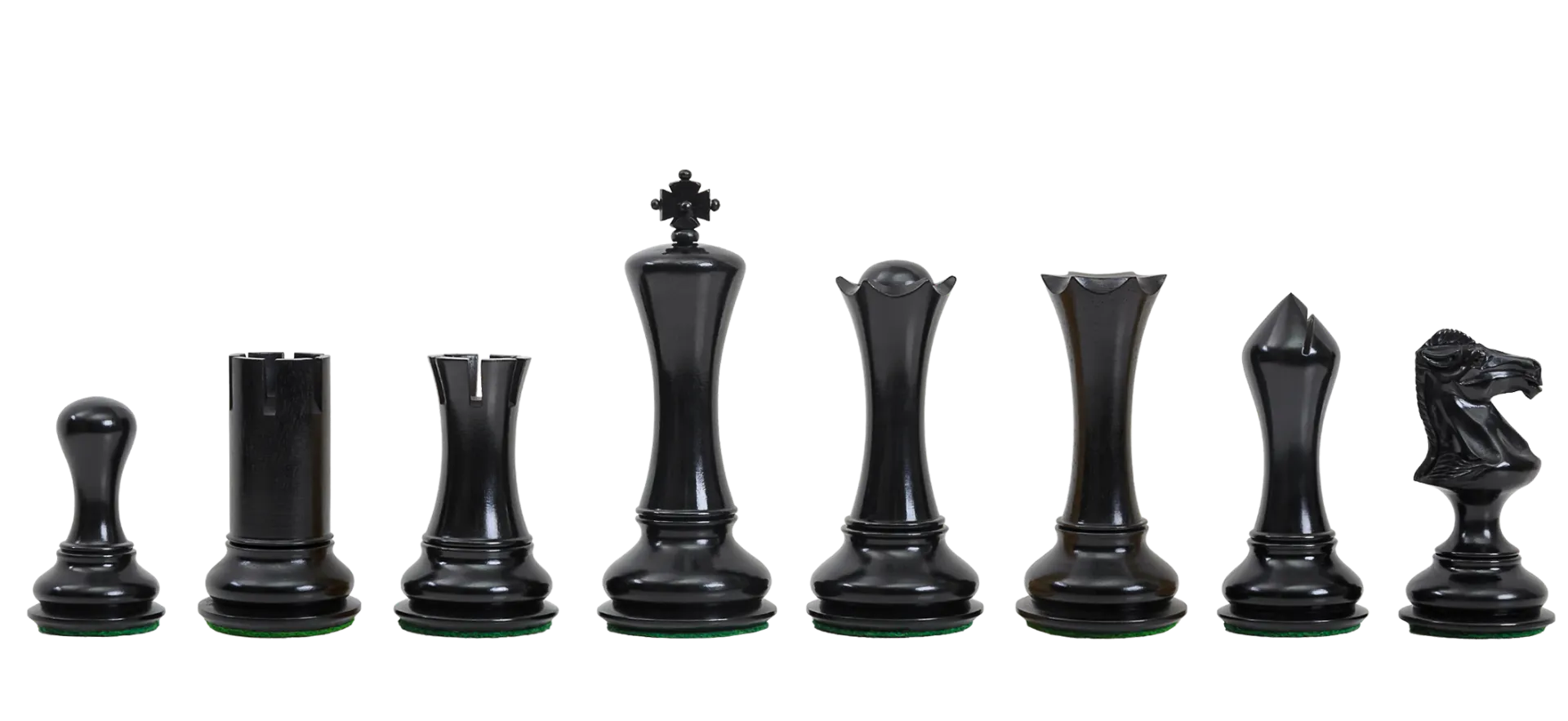 To pamper you, The House of Staunton is proud to offer the Empire Series Luxury Chess set. Designed by the Maestro himself, Frank A. Camaratta, Jr., it is a full Club-sized Chess set that features a 4.4 King with a 1.9" diameter base. The Chess pieces are hand carved by our master artisans and crafted out of the highest grade woods and are heavily weighted with gold embossed English Leather base pads under the Kings, luxurious billiard cloth base pads on the other Chess pieces and a beautiful finish. The design of the Empire Series Luxury Chess set features a strong hint of the Art Deco look that is reminiscent of the 1920s. The chess set has been designed to take abuse while retaining an elegance and aesthetic beauty that has not previously been seen in a playing chess set at any price. There are no fragile details subject to breakage, such as collars, ball finials and Queen's crenellations normally found in conventional Staunton chessmen. The Empire Series Luxury Chess set is ideal for those that are interested in an heirloom quality Chess set that is a true work of art, one that is as beautiful as it is functional.