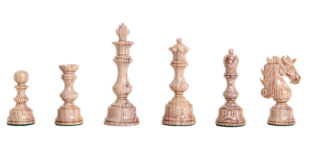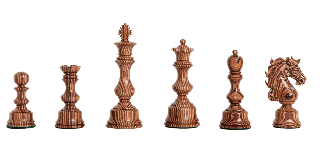 The House of Staunton is proud to offer the Treviso Exotique Series Luxury Chess Set. A full club-sized Chess set, it features a 4.4" King with a 1.5" diameter base. The Chess pieces are hand carved by our master artisans and crafted out of the highest grade woods. The Chess pieces are heavily weighted with green leather base pads for the Kings and luxurious billiard cloth for the other pieces and a beautiful finish.