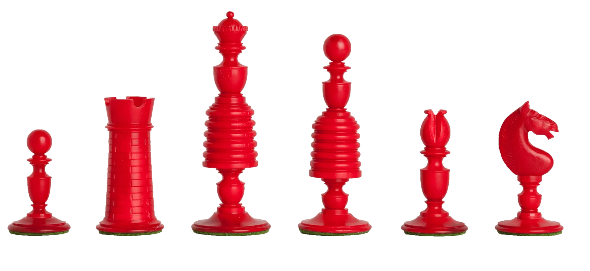 One side is stained red, the other is natural camel bone. , the kings have a very unusual "spikey" crown crenellations, the queens have ball tops, the bishops feature open mitres, knights as horses' heads and the rooks are represented as turrents with highly detailed brick work.